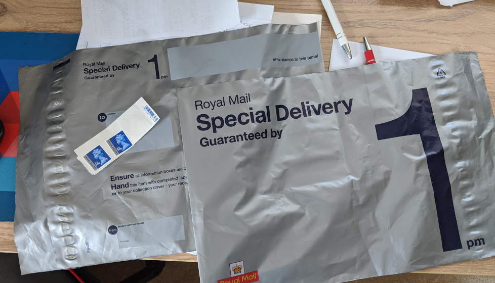 But my local post office was adamant you cannot "pre-pay" for special delivery. They were happy to give me these grey envelopes for free though, to be paid once it's ready to be posted, price dependant on weight.